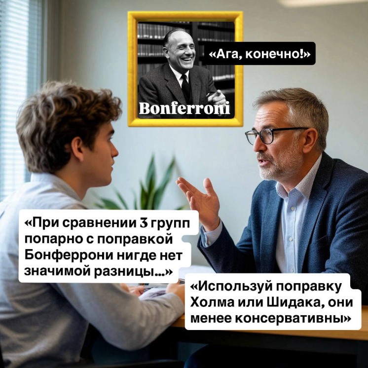 Теперь несколько слов о самой поправке. Поправка Бонферрони проста в применении, что объясняет её популярность. В классическом варианте она применяется к уровню значимости α, с которым исследователь сравнивает p-значения, чтобы сделать вывод о статистической значимости различий. Наиболее частой ситуацией, требующей поправки Бонферрони, является сравнение трех и более групп попарно для того, чтобы найти в одной…