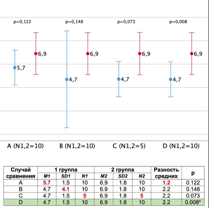 Посмотрим, как работают эти правила на примере сравнения 2 групп по количественному признаку. Результаты сравнений в 4 случаях: А, В, С и D — представлены на диаграмме. P-значение, определенное во всех случаях с помощью t Уэлча, оказалось ниже 0.05 (p=0.008) только в случае D, когда были выполнены все 3 условия: